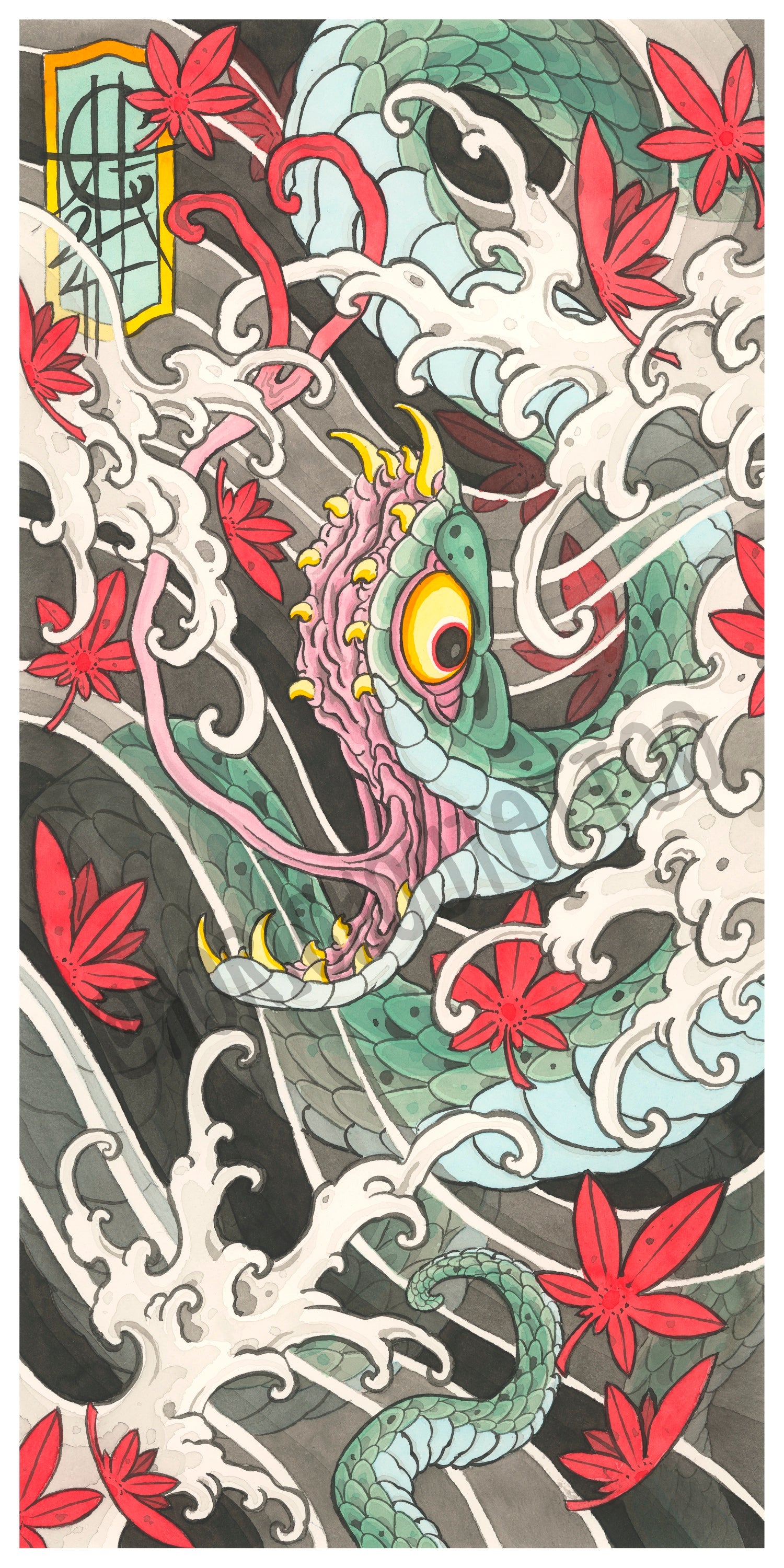 High quality Giclee print of a contemporary Irezumi design by @horichoutattoo. the design features a snake with a maple leaves and a water theme. The prints are limited to 10 and each piece is signed and numbered. The dimensions are 11x20inch.